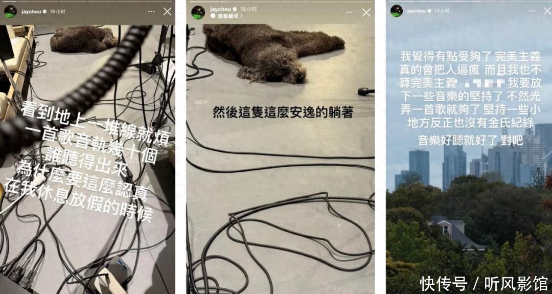 11日,据点时新闻,周杰伦在社交平台发文称被新歌“逼疯”:“看到地上一堆线就烦,一首歌音轨几十个谁听得出来,为什么要这么认真,在我休息放假的时候。”